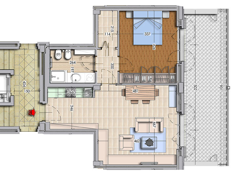 Canone mensile a partire da € 1.150 Composto da ingresso, soggiorno con cucina a vista arredata, bagno, ripostiglio, camera da letto matrimoniale, terrazzo, cantina di pertinenza.